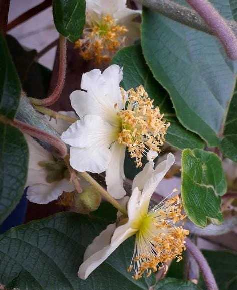 This robust climber blooms over a long period and is a necessary male pollinizer for fuzzy deliciosa females, as well as early-blooming hardy arguta kiwis, but not for later-blooming argutas or kolomikta kiwi varieties.